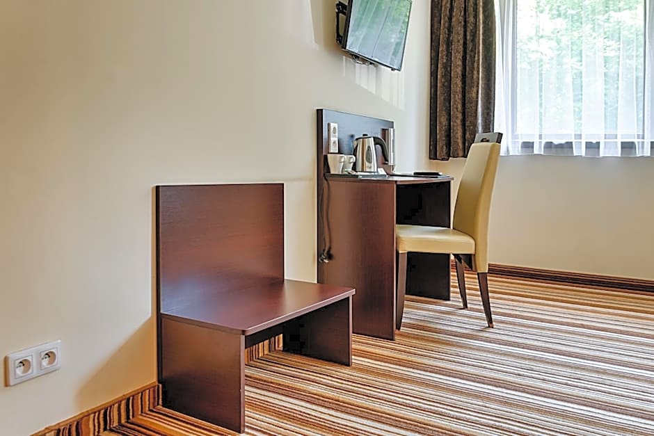 A classically furnished room with a desk and a bathroom. It features a flat-screen TV, as well as an electric-kettle and complimentary tea, coffee and mineral water.